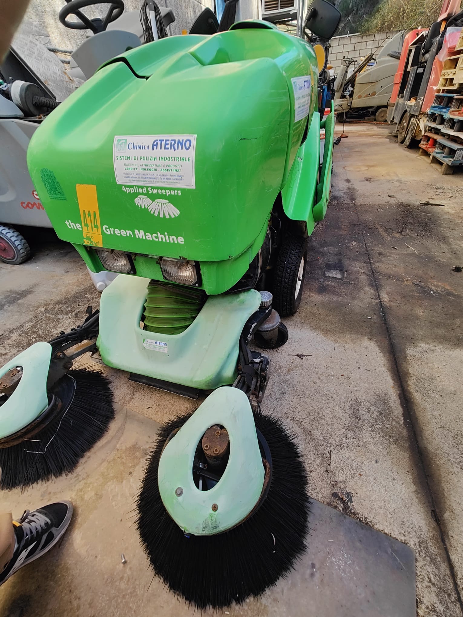 Motospazzatrice stradale aspirante diesel GREEN MACHINE 414 Diesel. Con sistema di aspirazione, seduta posteriore per operatore. Macchina usata. Tagliandata con filtri e spazzole nuove. Ideale per pulizia di marciapiedi, strade, viali, piazzali dove ci sono foglie e materiale voluminoso. Grazie al motore Diesel riesce a coprire medie e grandi superfici.