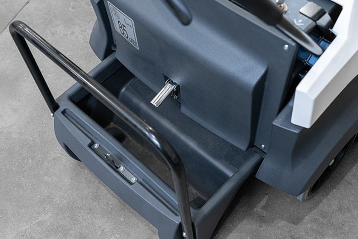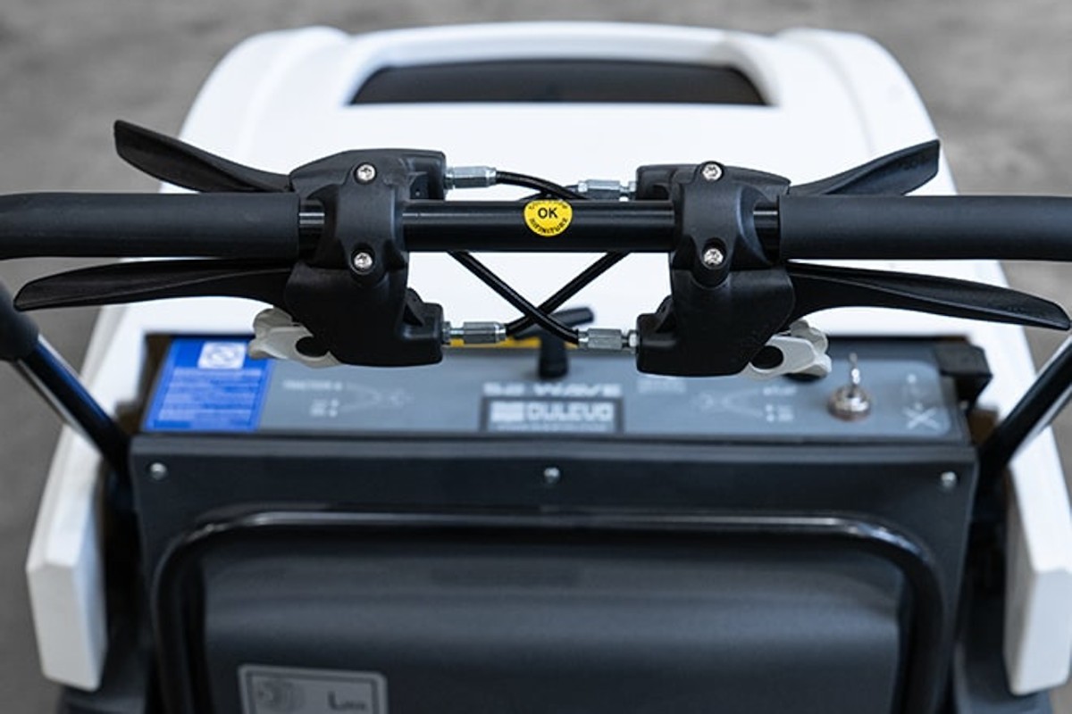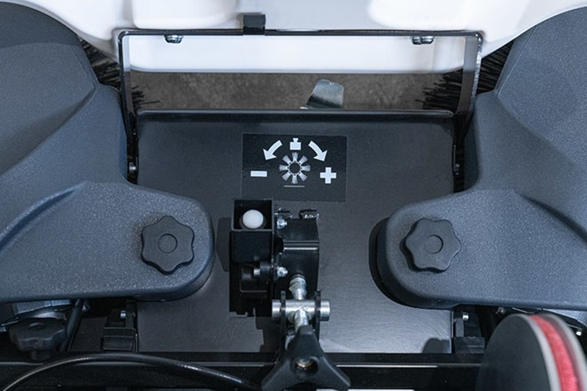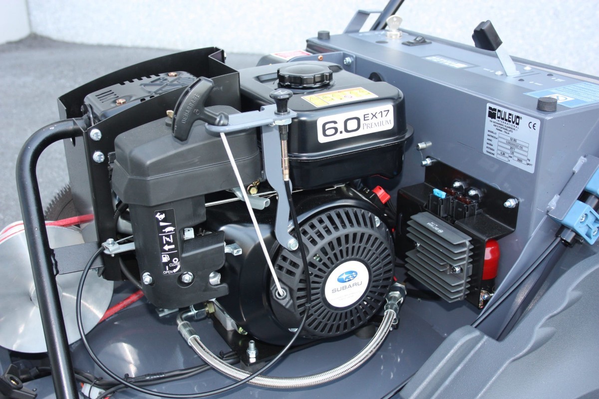 - Cruscotto completo di chiave d’accensione e leve di comando spazzamento e trazione Manubrio regolabile in altezza