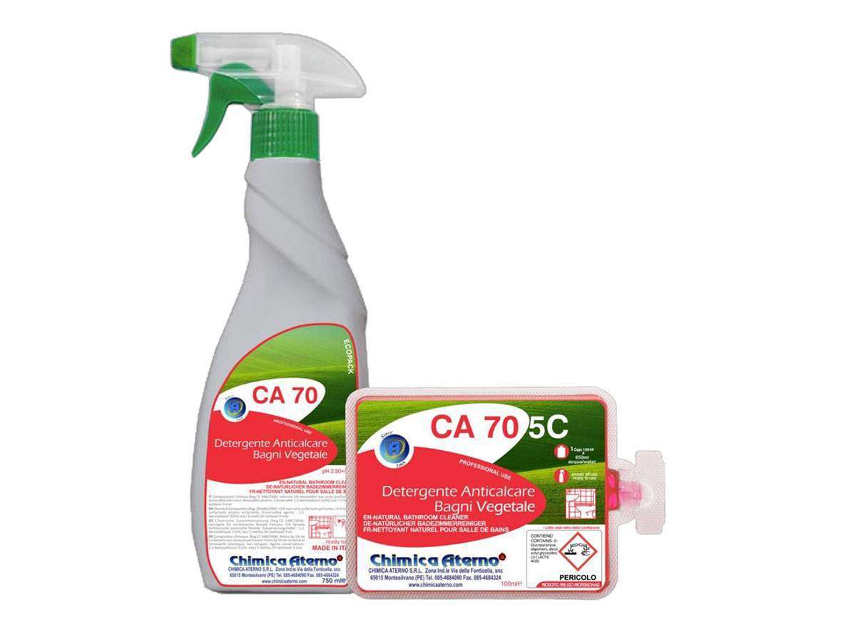 CA70 è un detergente anticalcare Bagni vegetale. Agisce efficacemente contro sporco e calcare lasciando le superfici brillanti. Formulato per la pulizia quotidiana di lavandini e vasche in ceramica bianca in bagno, box doccia e rubinetterie, fino ai lavelli in acciaio in cucina.